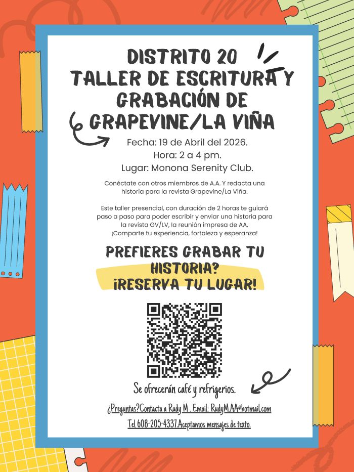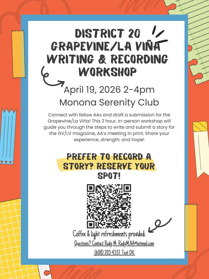 Connect with Fellow AAs and draft a submission for the Grapevine/La Viña! This 2 hour, in-person workshop will guide you through the steps to write and submit a story for the GV/LV magazine, AA’s meeting in print. Share your experience, strength, and hope!